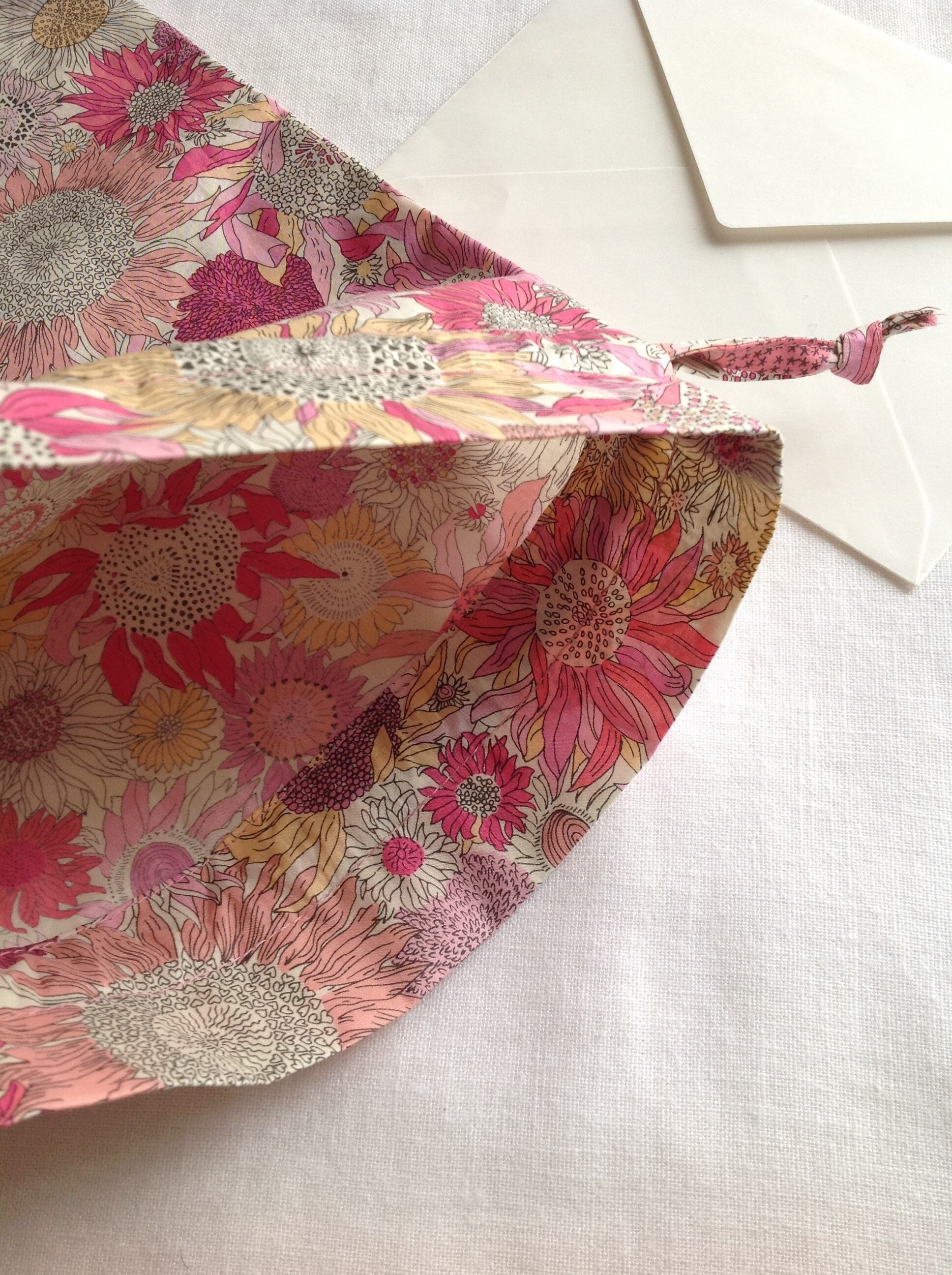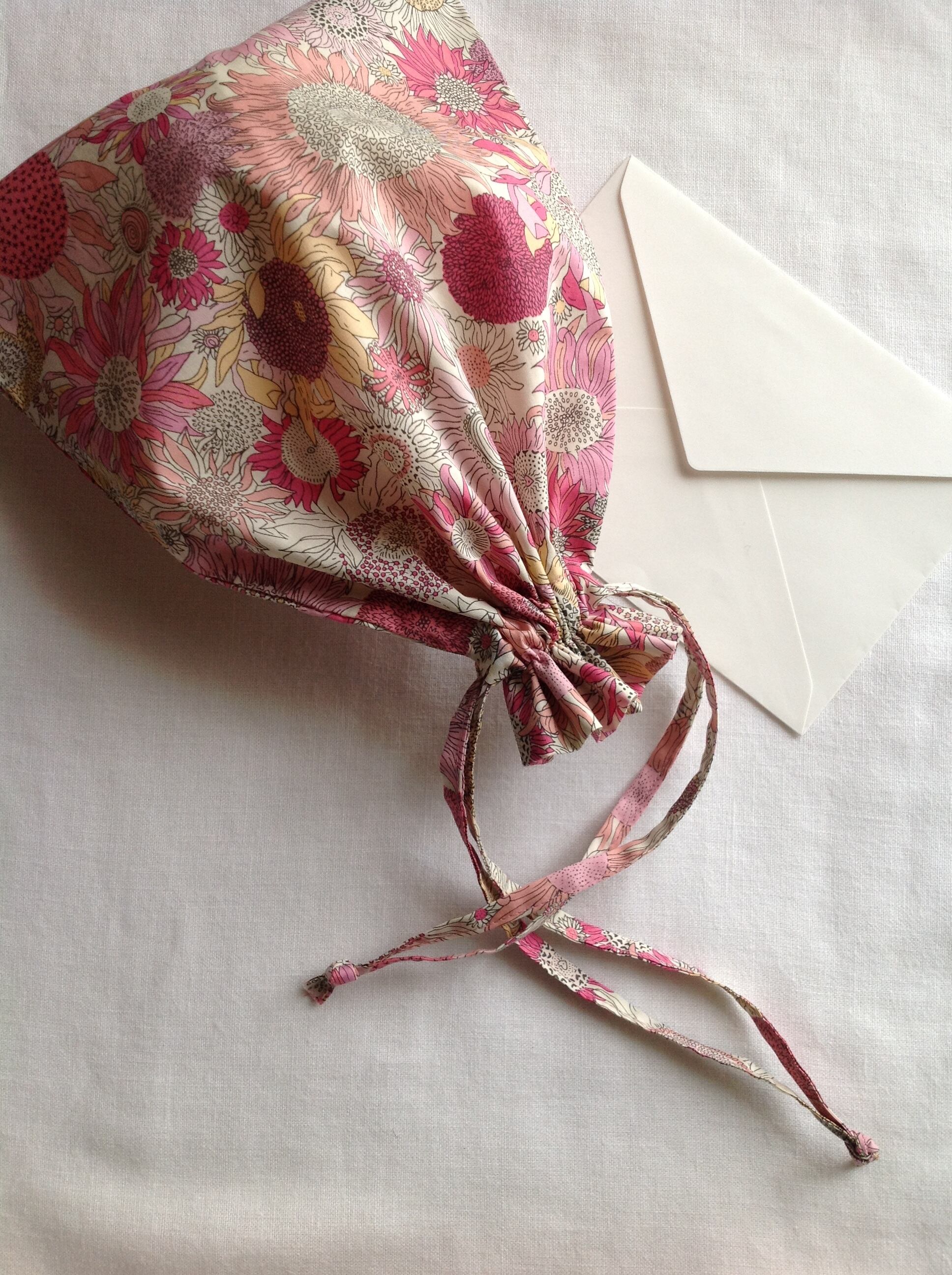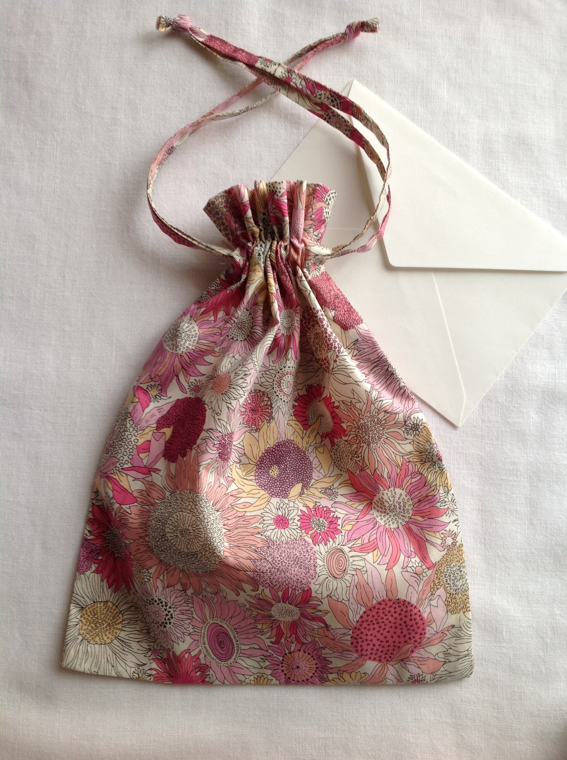 リバティプリント生地が美しい袋です。