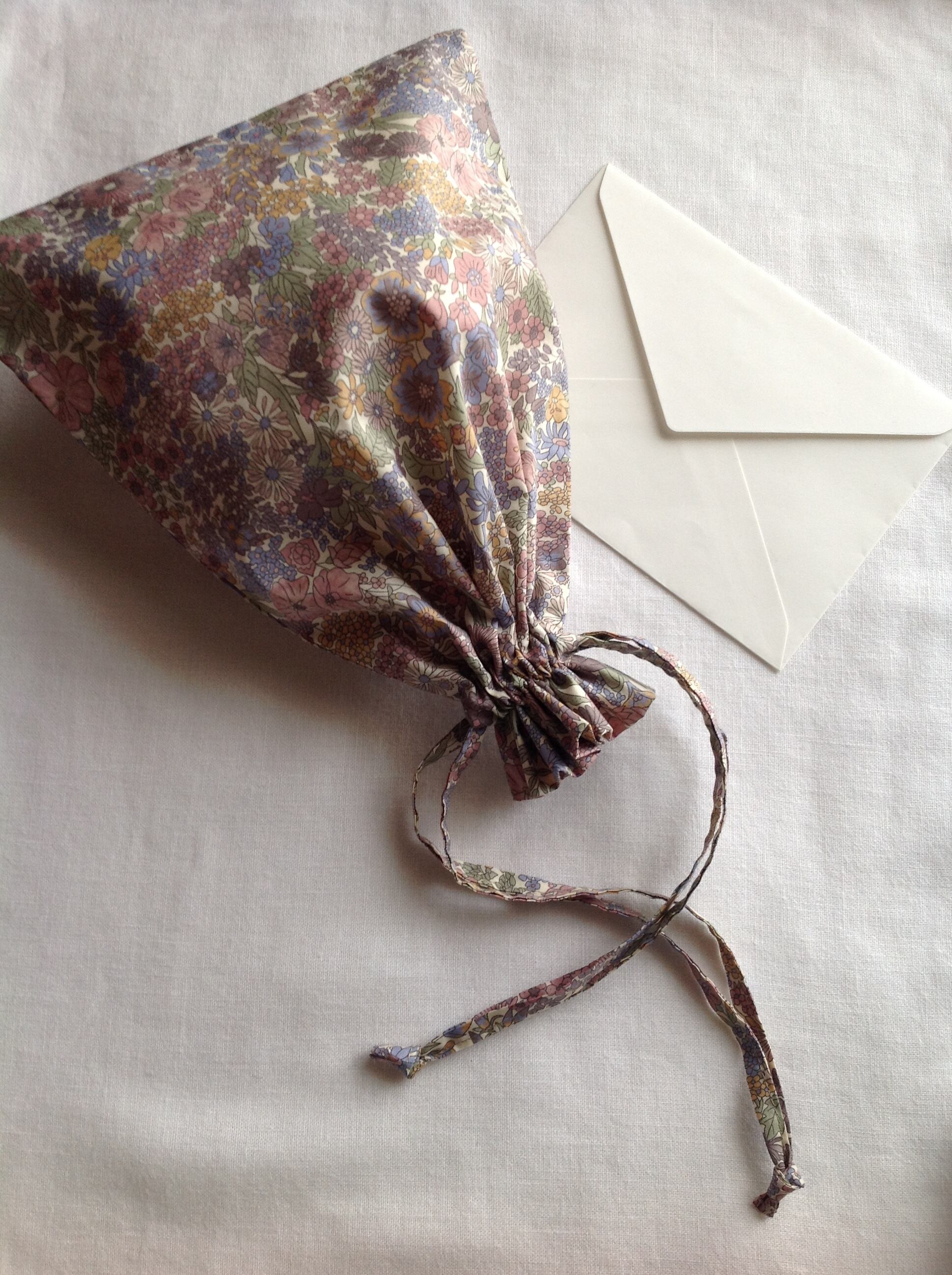 リバティプリント生地が美しい袋です。